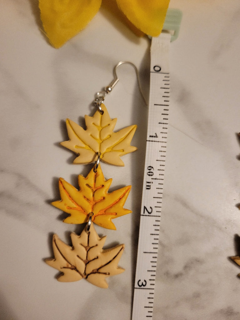 Let the rhythm of fall dance from your ears with Maple Melody Drops. These handcrafted earrings feature three stacked maple leaves in soft seasonal shades, each one etched with lifelike detail. A harmonious blend of nature and style, theyโ€™re perfect for adding a whisper of woodland wonder to your look.