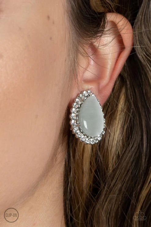 A glassy white teardrop cat's eye stone is pressed into a ring of glassy white rhinestones, creating a glamorous frame. Earring attaches to a standard clip-on fitting.