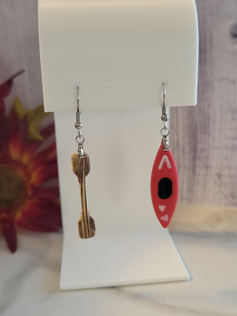 Celebrate your love for the water with this handcrafted mismatched earring set, inspired by the thrill of kayaking and the serenity of lakeside escapes. One fishhook earring features a vibrant red kayak with crisp white accents and a black cockpit, while its partner showcases a rustic brown paddle with realistic carved texture — a perfect pairing for outdoor enthusiasts.