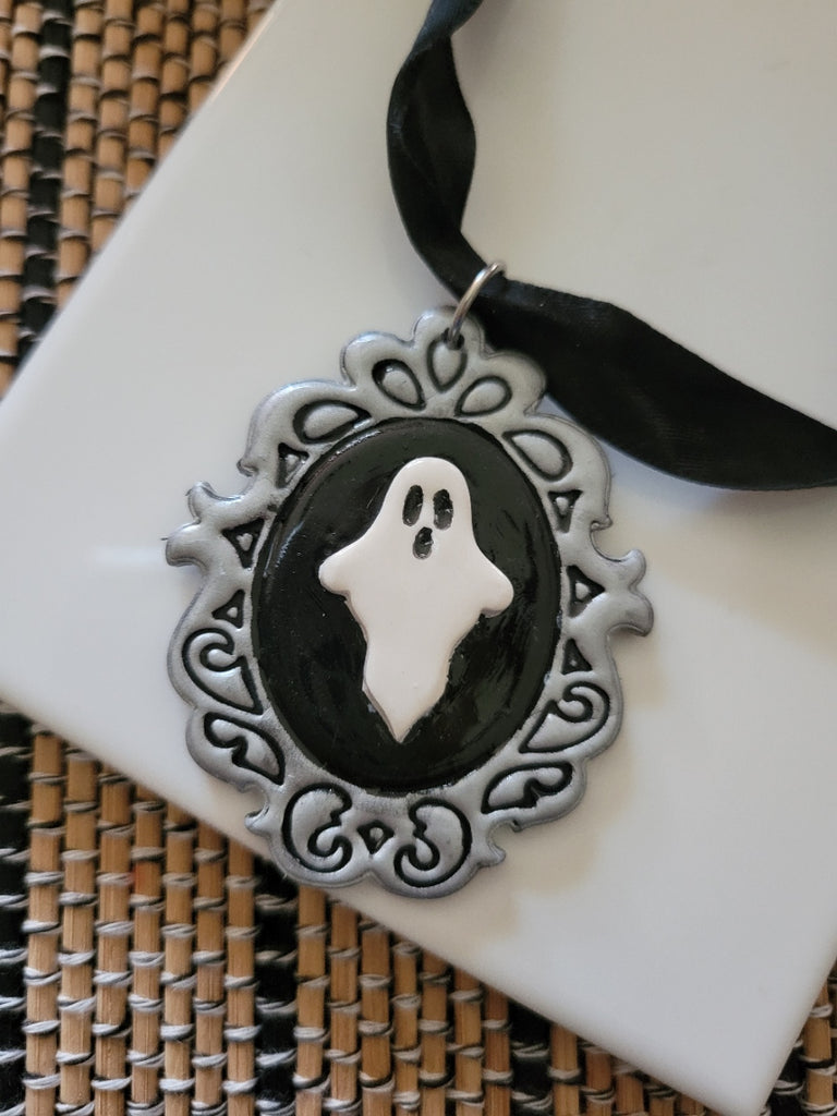 This handcrafted choker necklace conjures a perfect blend of eerie charm and vintage sophistication. The centerpiece is an oval polymer clay pendant set against a deep black background, featuring a ghostly white figure that seems to float in silence. Surrounded in an ornate silver colored frame, the pendant evokes the feel of a Victorian keepsake with a supernatural twist.