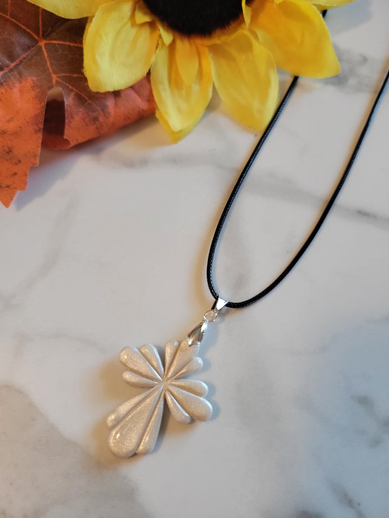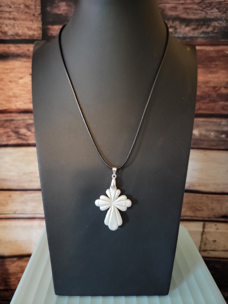 This handcrafted cross pendant necklace is a radiant expression of faith, hope, and artistry. Sculpted from polymer clay and sealed with a high-gloss resin top coat, the pendant gleams with a pearlescent finish that catches the light beautifully—symbolizing grace that shines even in quiet moments. Its clean, symmetrical design evokes a sense of peace and balance, while the black cord adds a modern, grounding contrast that makes it versatile for everyday wear.