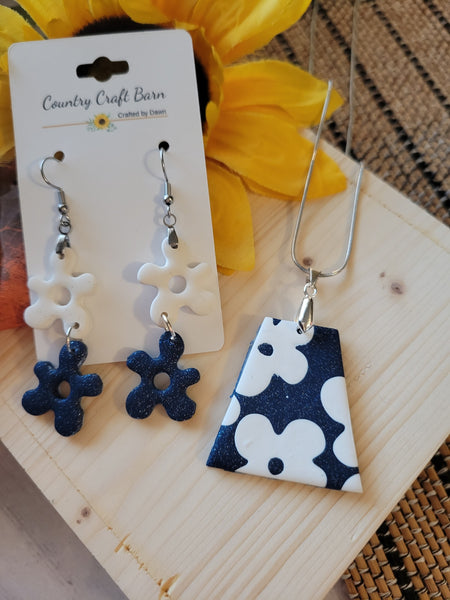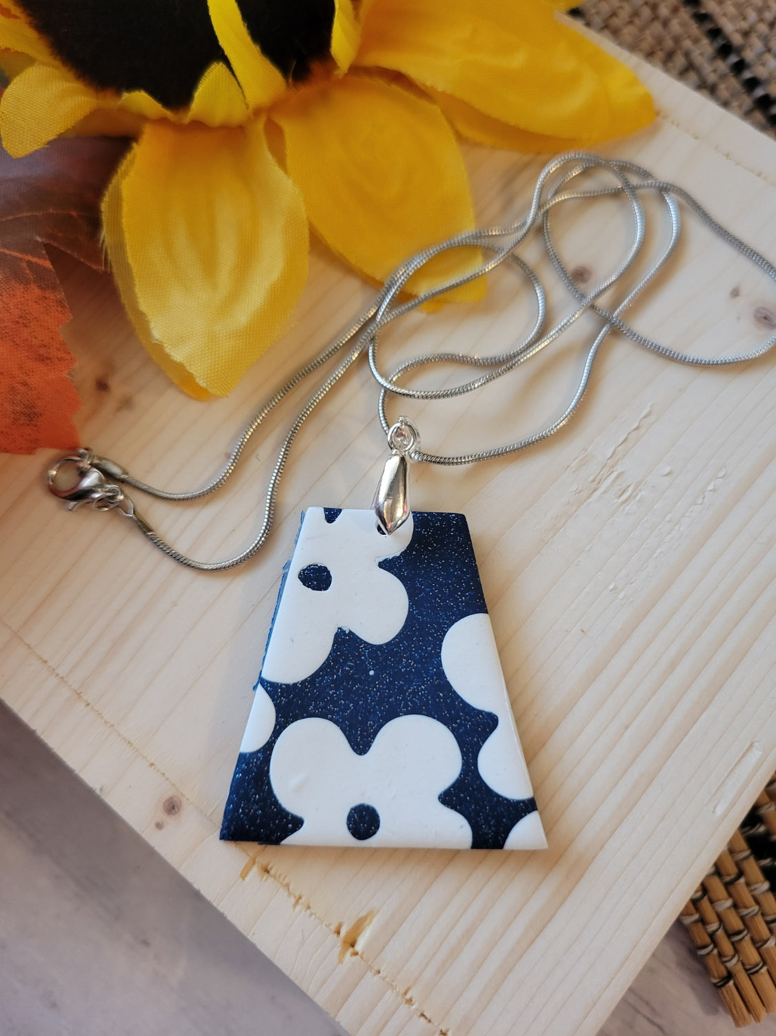 The Midnight Bloom Pendant is a bold and modern polymer clay necklace featuring a trapezoid-shaped charm adorned with whimsical white flowers on a deep navy blue background speckled with subtle shimmer. Each flower pops against the midnight backdrop, giving it a playful yet elegant look. The pendant is paired with a sleek silver-tone snake chain and polished bail, making it a stylish statement piece perfect for casual or dressy occasions. Inspired by moonlit gardens and retro floral patterns, this piece is a charming blend of vintage flair and contemporary craft.