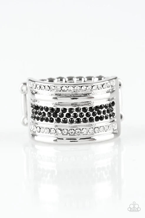 Black and white rhinestone encrusted bands stack across the finger for a glamorous look. Features a stretchy band for a flexible fit. Sold as one individual ring.