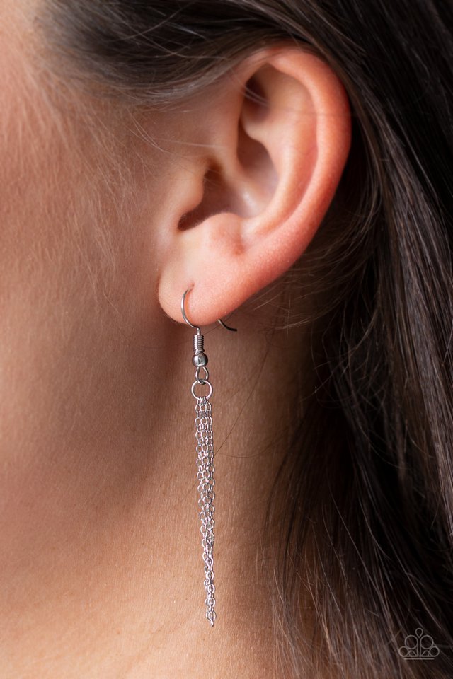 A square black bead is pressed into the center of a silver geometric pendant radiating with studded detail. A shimmery silver fringe swings from the bottom of the tribal inspired frame for a wanderlust finish. Features an adjustable clasp closure.