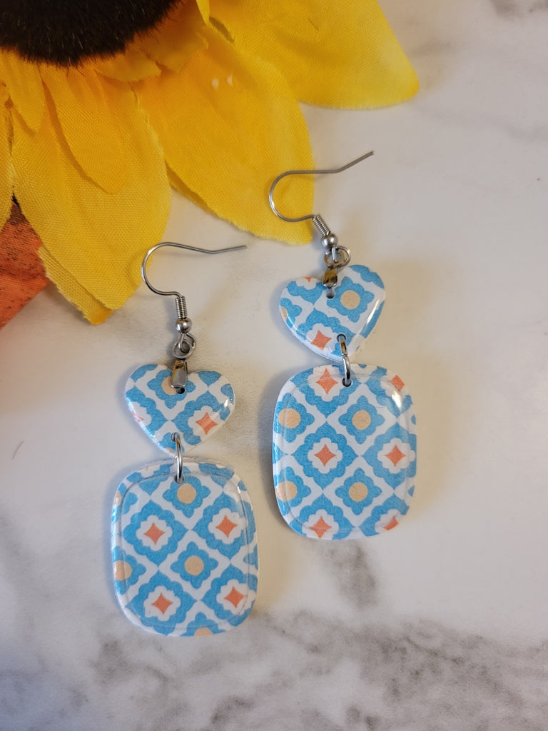 These polymer clay earrings feature a bold geometric pattern in rich blues, oranges, and whites, reminiscent of Mediterranean tilework. The heart-and-square duo adds playful symmetry, while the glossy resin top coat enhances the colors and protects the design.