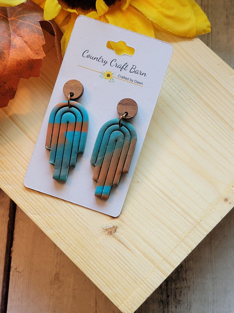 Inspired by desert landscapes and bold modern design, these handcrafted polymer clay earrings feature a layered arch motif in rich tones of turquoise blue, warm tan, and earthy brown. The soft matte finish adds a natural feel, while the rounded post backs in deep espresso provide a contemporary contrast. Lightweight and comfortable, these statement earrings are perfect for adding a pop of color and artistry to any outfit.