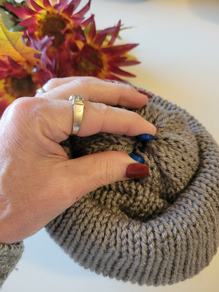Loomed Knit cap. The Pom Pom is removable, and the hat is reversible.