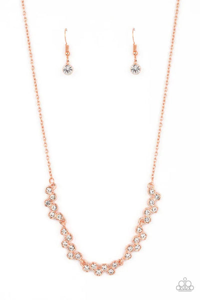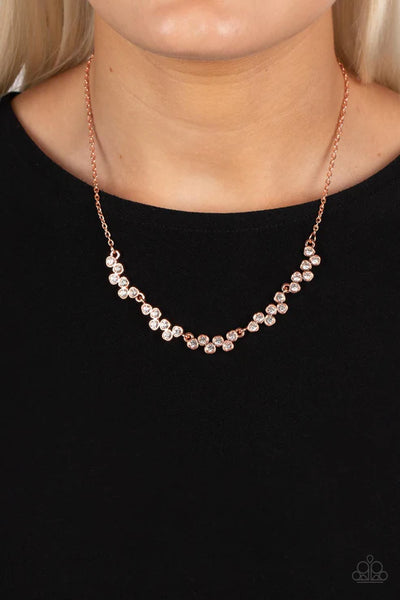 Dotted with glassy white rhinestones, dainty clusters of shiny copper heart frames delicately connect below the collar for a timeless twinkle. Features an adjustable clasp closure.