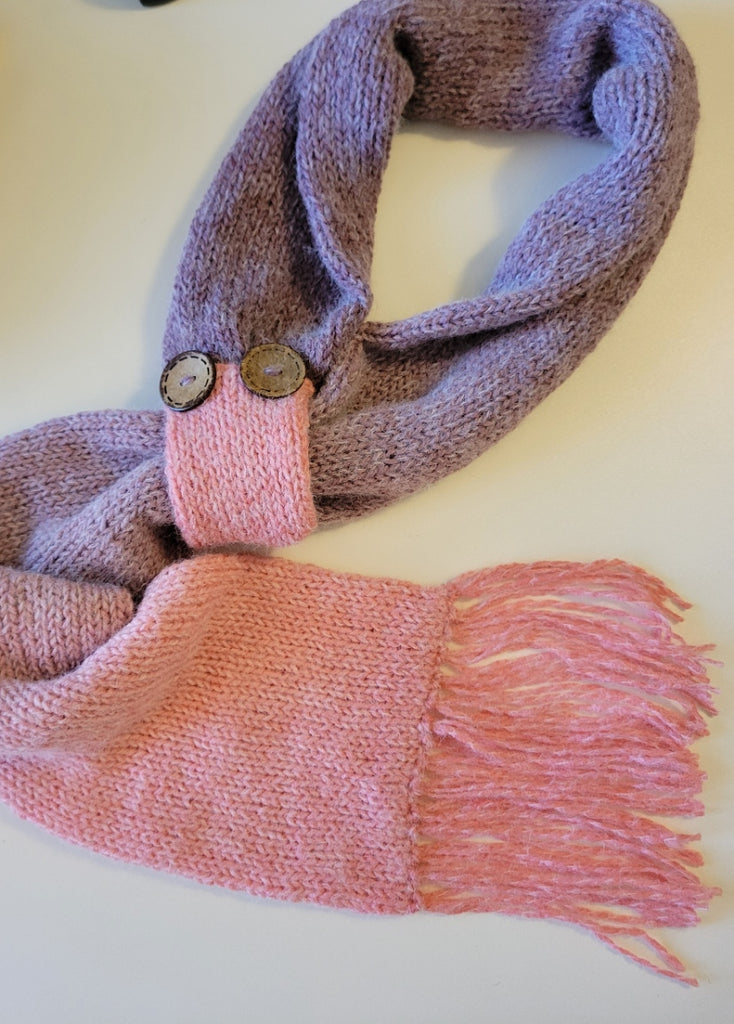 The scarf has faux buttons with a loop for the other end to be snuggly secured.