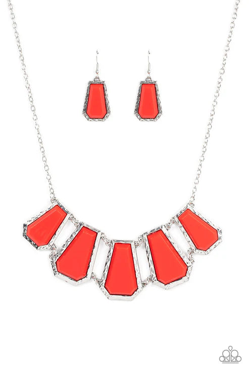 Encased in hammered silver fittings, trapezoidal red acrylic frames delicately fan out below the collar for a dramatic pop of color. Features an adjustable clasp closure.