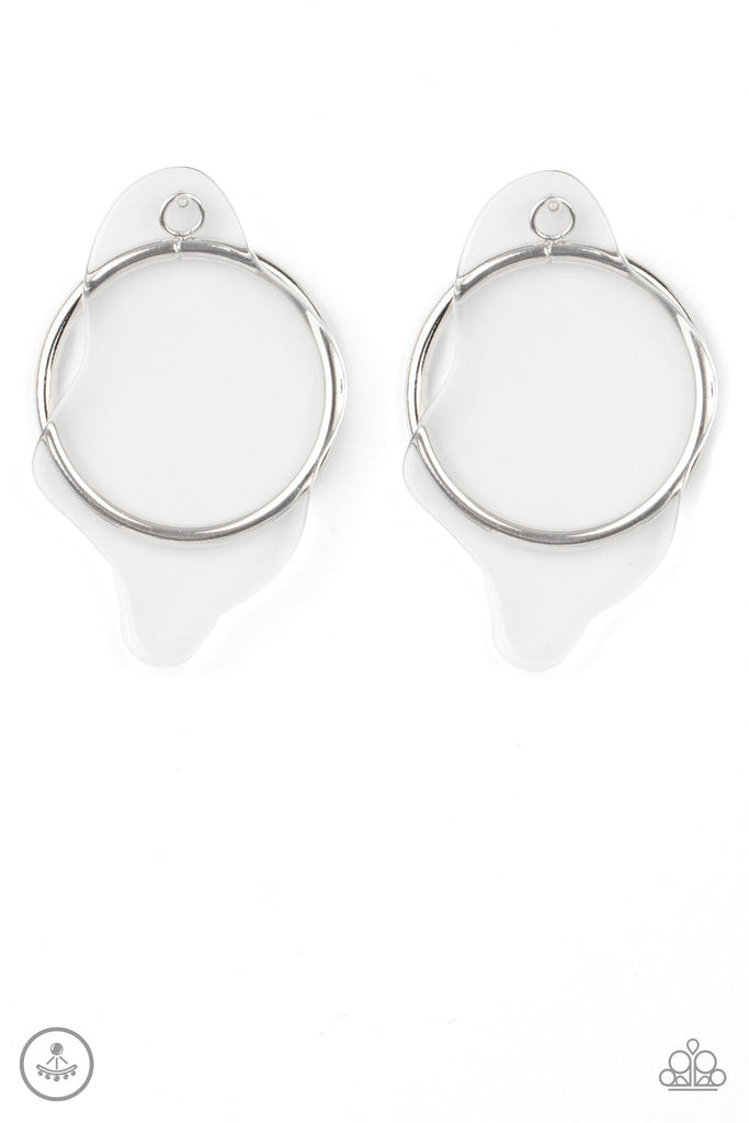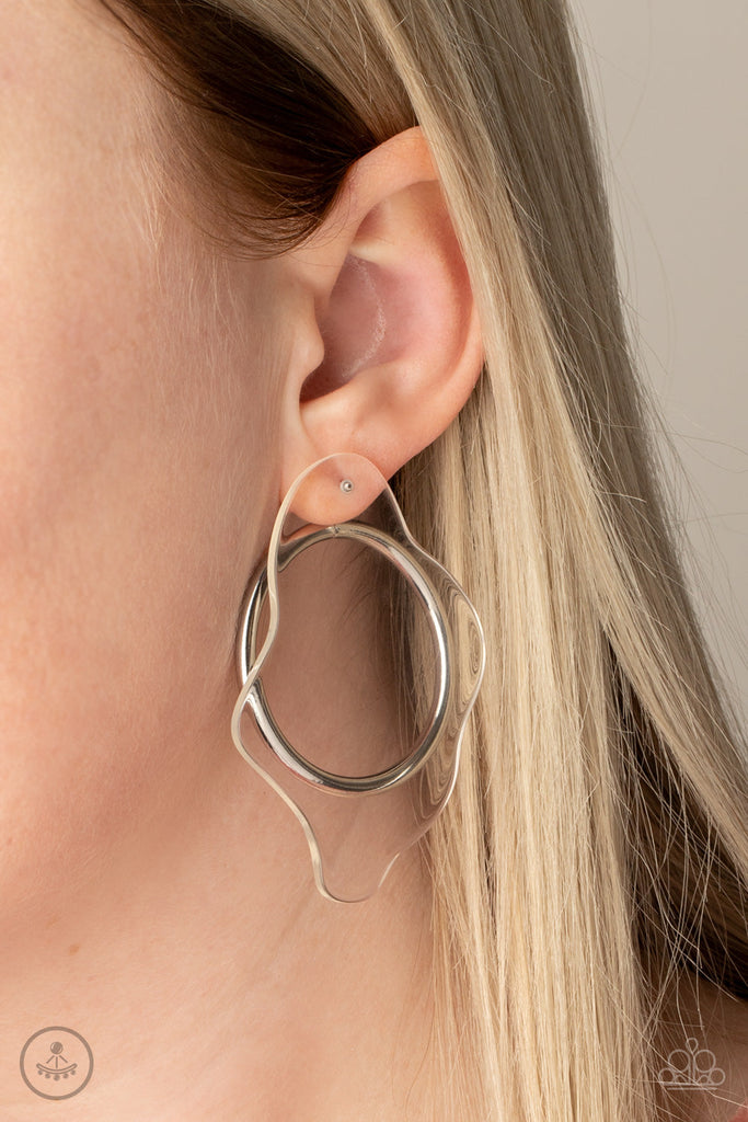 A warped piece of clear acrylic attaches to a double-sided post, while an oversized silver hoop peeks out beneath the ear for a bold look. Earring attaches to a standard post fitting.