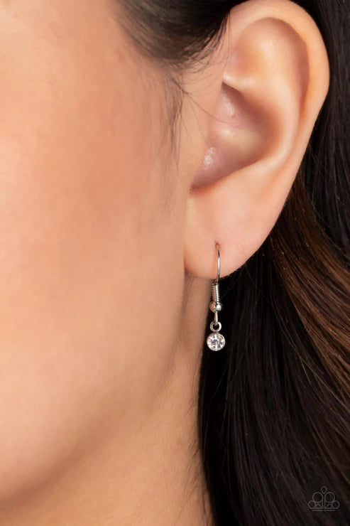 A small, heart-shaped pendant is filled with tiny white rhinestones that wrap around a keyhole cutout at its center. A small silver key, dotted with dainty white rhinestones and featuring a heart-shaped silhouette at the top, slides along the skinny silver ball chain next to the lock, completing the set. Features an adjustable clasp closure.