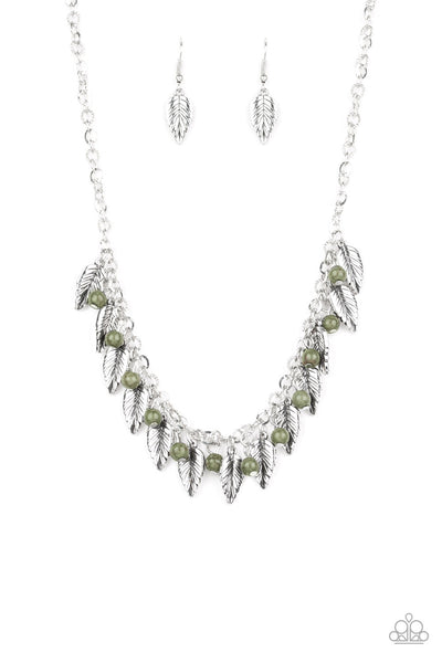 Shimmery silver feather charms and earthy green stone beads alternate along a shiny silver chain, creating a feathery fringe below the collar. Features an adjustable clasp closure.