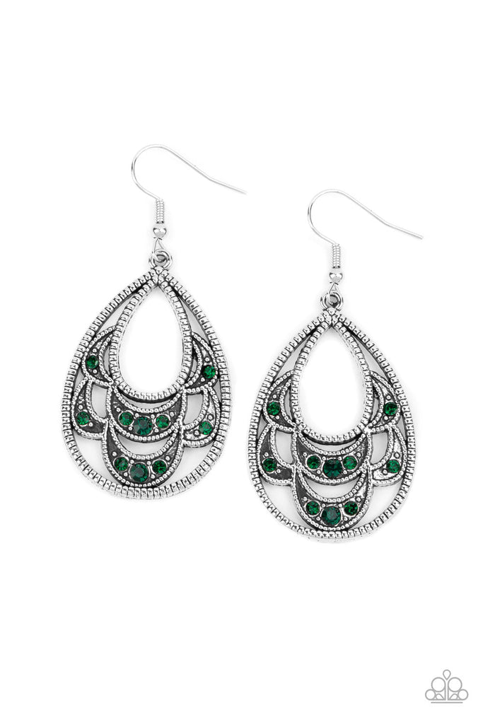 Dotted in dainty green rhinestones, studded silver petals layer into an ornate silver teardrop for a whimsical look. Earring attaches to a standard fishhook fitting.