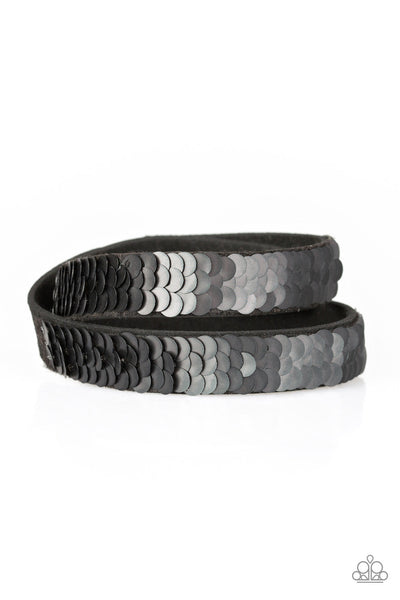 Row after row of shimmery sequins are stitched across the front of a lengthened black suede band. The elongated band allows for a trendy double wrap design. Bracelet features reversible sequins that change from gold to black. Features an adjustable snap closure.